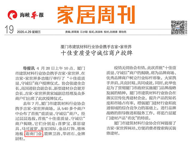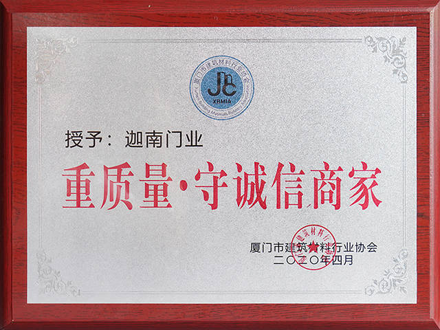 近日,厦门市建筑材料行业协会举行了“十佳重质量守诚信”企业授牌仪式,迦南门业凭借优质的产品以及良好的社会诚信,荣获“重质量守诚信”称号。