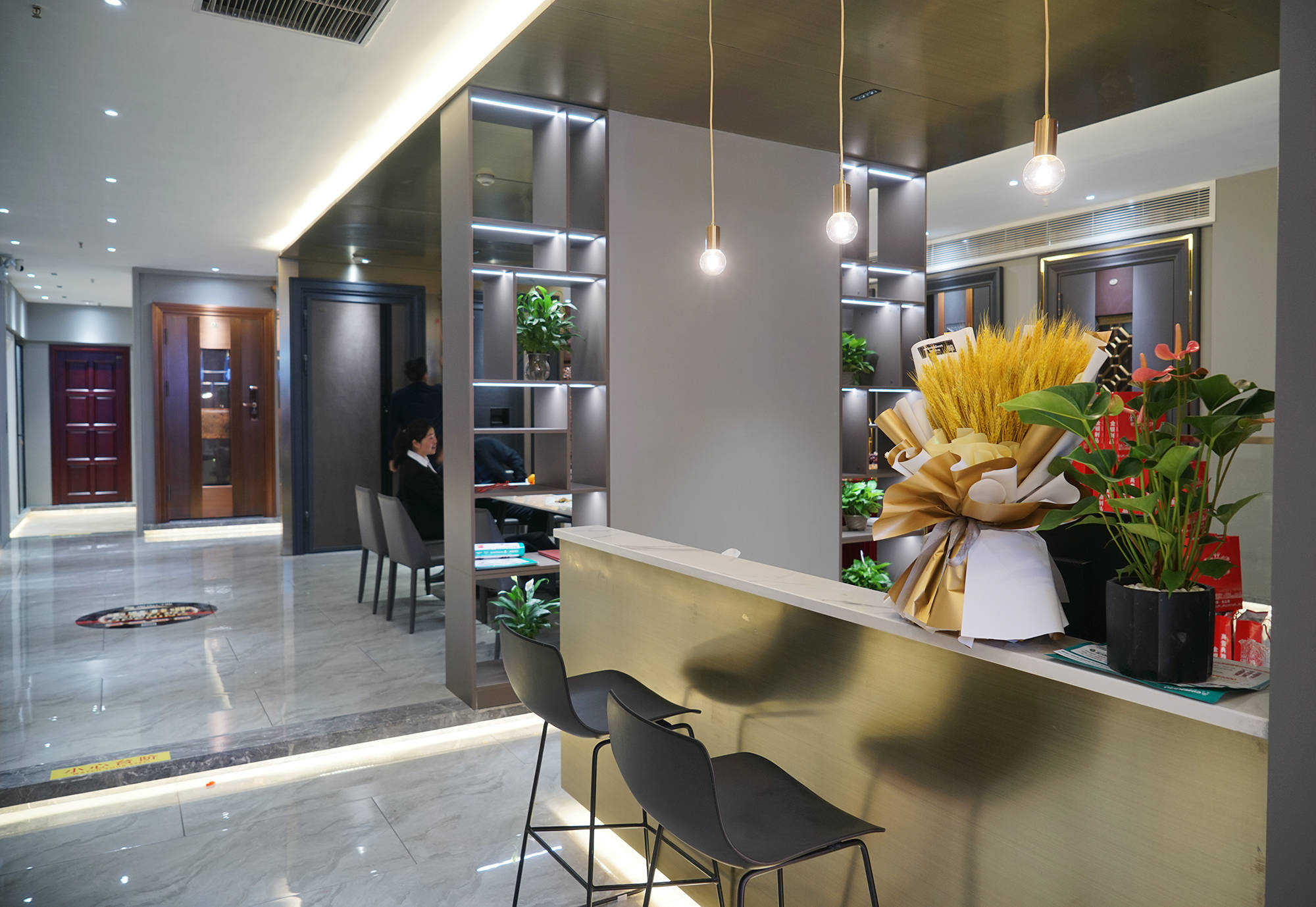 产品阵容方面,涵盖装甲门、铜门、钢艺门、室内木,满足客户的一站式购物需求。设计师从美学的角度出发,让每一款产品都有序地陈列于墙面,呈现对产品的聚焦导向,为人们带来体验式参观之旅。